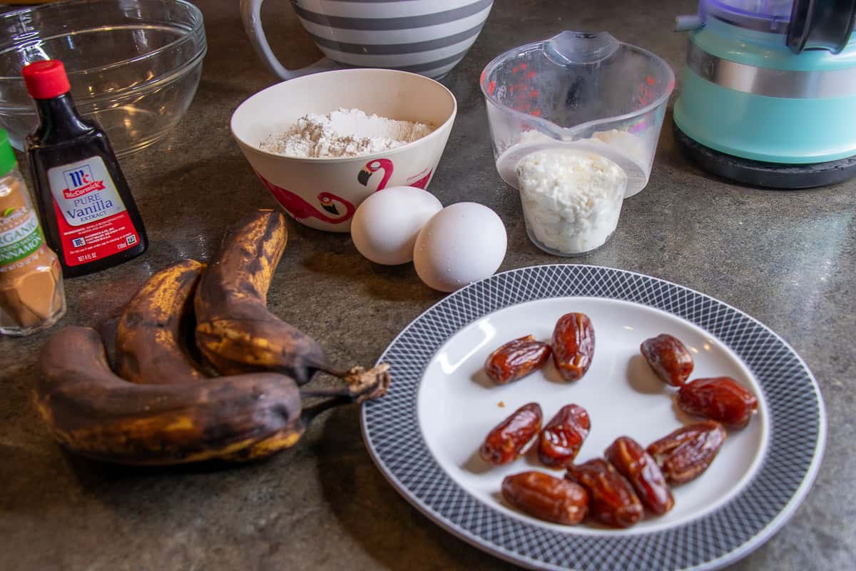 Any type of bread seems like it might take tons of time and be difficult to make, but not this banana bread. We used a small food processor to make this. The dates were chopped up first, and then we added the cottage cheese, eggs, and vanilla.