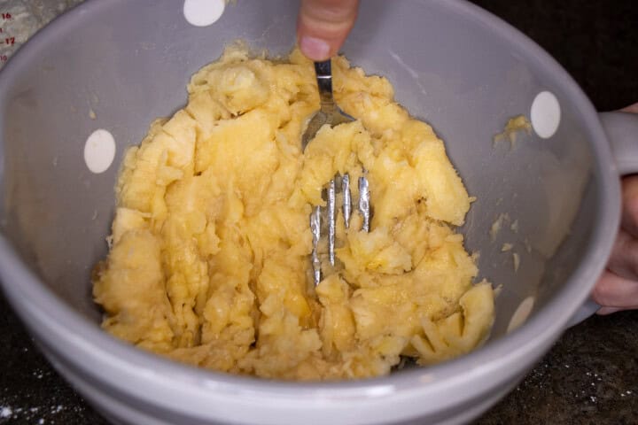 The star of the dish is the banana. Make sure to use ripe bananas. Chop the ripe bananas with a fork in a meduim sized bowl