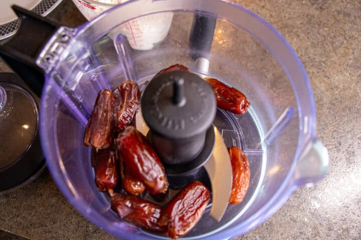 Coarsely chop the dates in a food processor. Add ⅓ cup of water to the dates and blend. This will make a paste with the dates and water.