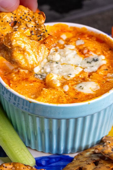 Buffalo Chicken Dip has become a favorite treat in our home, perfect for game day, movie nights, or party appetizers! This is our version of this viral high-protein, lower-calorie recipe. It's a mix of shredded chicken, Ranch dressing, hot sauce (we love the buffalo chicken dip with franks buffalo sauce), cheddar cheese, and cottage cheese. Yes, cottage cheese!!! The Buffalo Chicken dip is baked until golden and bubbly on top, then finished with a layer of Blue cheese. This dip is great for dipping using celery, carrots, pretzels, or chips. Hey, you could even dip a chicken wing in it if you want double chicken!