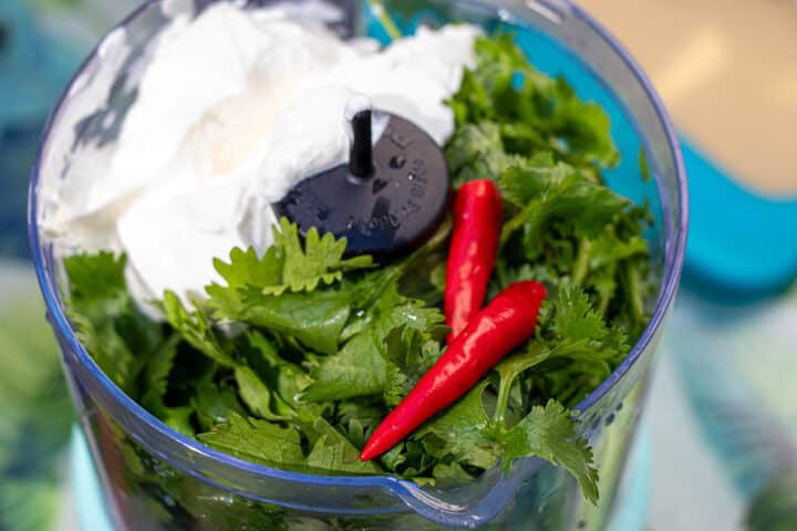 - In a food processor add the cilantro, sour cream, salt, red wine vinegar, and line juice. For some extra spice, we added 2 Thai peppers. Blend the sauce until it is smooth about 3 mintues1 Cup Sour Cream, 2 Tablespoons Red Wine Vinegar, 2 teaspoons Salt, 1 Lime