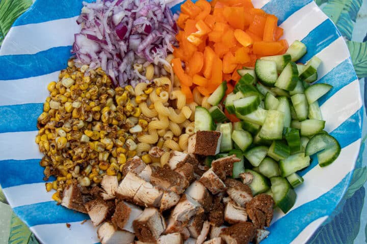 - In a bowl Toss together the pasta, corn, onion, sweet pepper, cucumbers, chicken, and serrano peppers if using.1 ½ Cups Cucumber