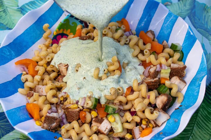 Mix together the veggies, chicken, pasta, and sauce for this Easy Pasta Salad.