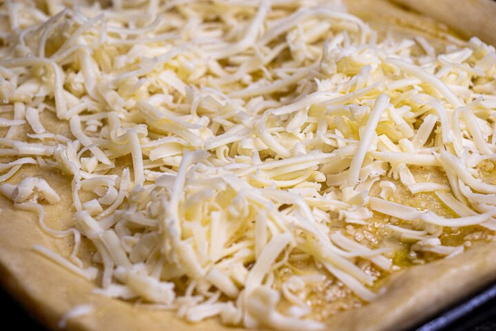 - Mix the cheeses together and sprinkle on top of the pizza crust.