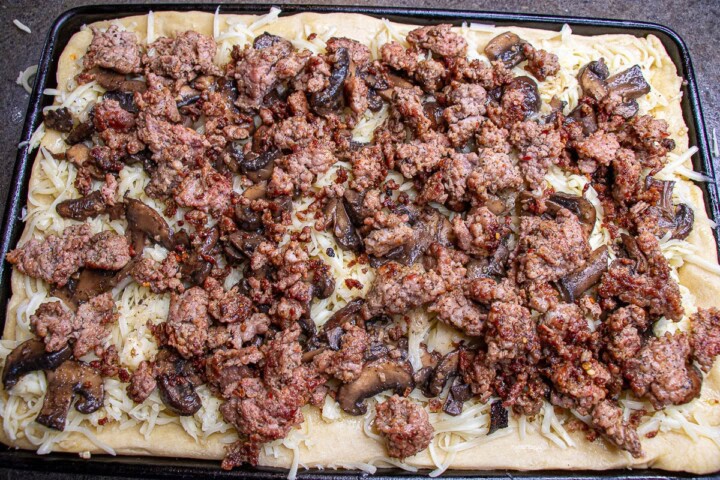 Top the pizza with the shredded cheese (NY sharp cheddar, mozzarella, and fontina). Make sure to mix them together so that every piece of this delicious four-cheese pizza has all the flavors! Top with the cooked mushrooms and cooked sausage, and then top with spoonfuls of the ricotta cheese.