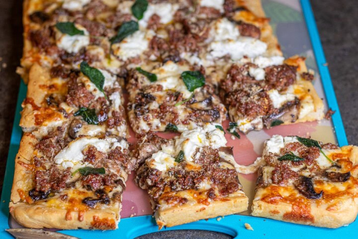 Pizza night is always a blast! This four-cheese pizza recipe with sausage, mushrooms, and a touch of fresh sage is absolutely delicious! The NY sharp cheddar has such a delightful sweet and sharp flavor, Fontina cheese is creamy and mild with a nice savory nutty taste, Ricotta cheese has a lovely creamy texture with a subtle flavor, and of course, mozzarella cheese is creamy and, well, it’s a must-have on pizza!