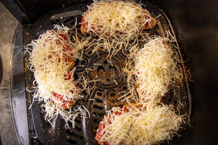 Once the chicken is cooked, go ahead and spread about ¼ cup of marinara sauce on top of each chicken breast. Then, sprinkle ½ ounce of mozzarella cheese on each chicken breast. Pop them in the air fryer or bake them until the cheese is all nicely melted.
