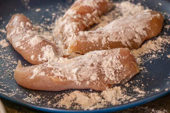 - Cut Chicken Breast in half or wrap the chicken in saran wrap and beat it until it is about ½ thick. I like to use chicken tenders. Sprinkle cornstarch on the Chicken Breast.