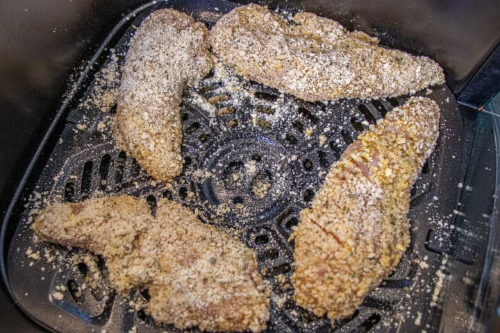Once the chicken breasts are coated with the panko mixture, they're good to go for cooking. We personally like using the air fryer because it's quicker, but the oven works great, too. Lightly spray the chicken with cooking spray. I like to use olive oil or butter spray.