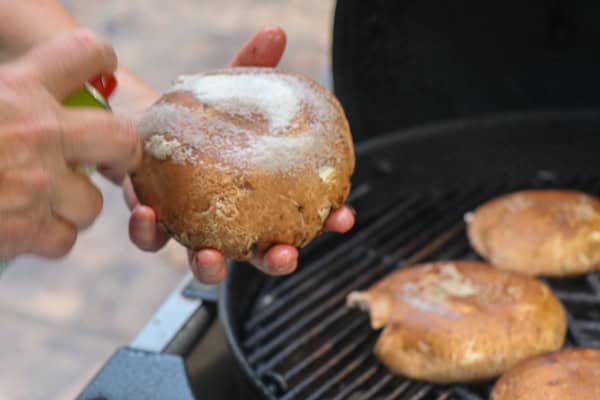 Grilled mushrooms are juicy and extremely flavorful, and they have a meaty texture. We start by spraying Pam Olive Oil spray over the mushrooms. Then placing them face down on the grill over the coals.