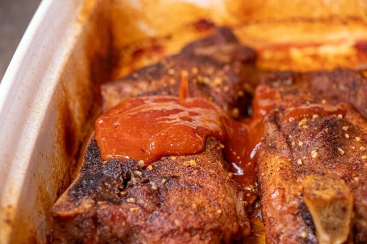 To finish this country ribs recipe, place the ribs back in the oven for 30 minutes. Remove and add additional BBQ sauce if you want, or serve the ribs with some additional BBQ sauce on the side.