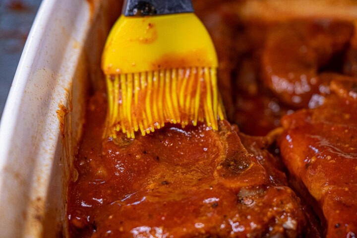Remove the country-style ribs from the oven. It should be easy to pull the ribs apart with a fork. Using a basting brush, coat the ribs with the BBQ sauce. I used about a cup of BBQ sauce for the ribs.