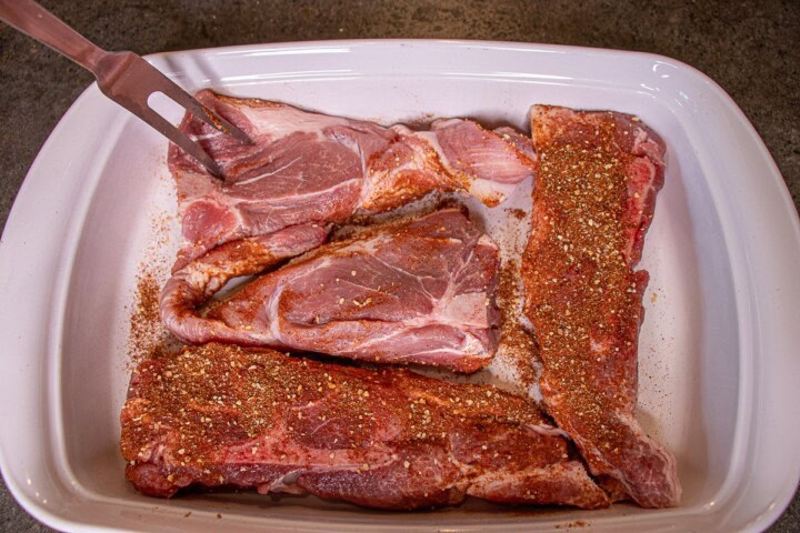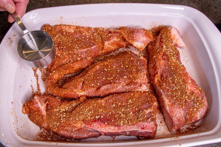 - Place the ribs in a casserole dish. Sprinkle the seasoning on the ribs.